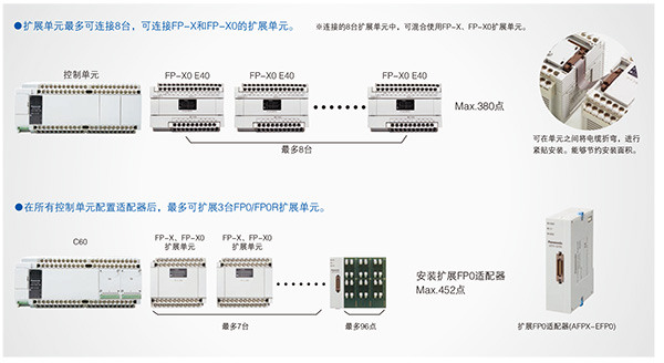| 控制I/O点数 | 控制单元通用输入输出部:16 点(DC 输入:8 点/晶体管输出:8 点) 使用E16 扩展I/O 单元时:最多32 点 使用E30 扩展I/O 单元时:最多256 点(最多扩展8 台) 使用FP0R 扩展单元时:最多112 点(最多扩展3 台) | ||
