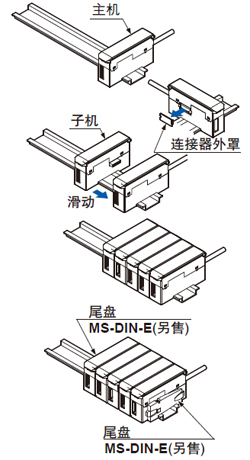 | ・ | 连接时,请务必在DIN导轨上进行安装。此时,请从两侧夹入尾盘MS-DIN-E(另售)进行安装。 |